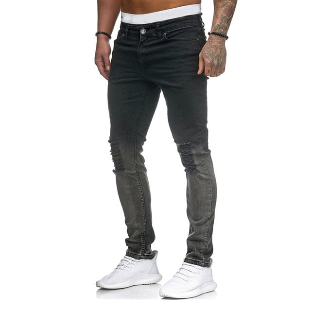 2019 New Mens Denim Jeans Fashion Patchwork Skinny Pants Slim Fit Zipper Destroyed Style Ripped Male Elastic Trousers